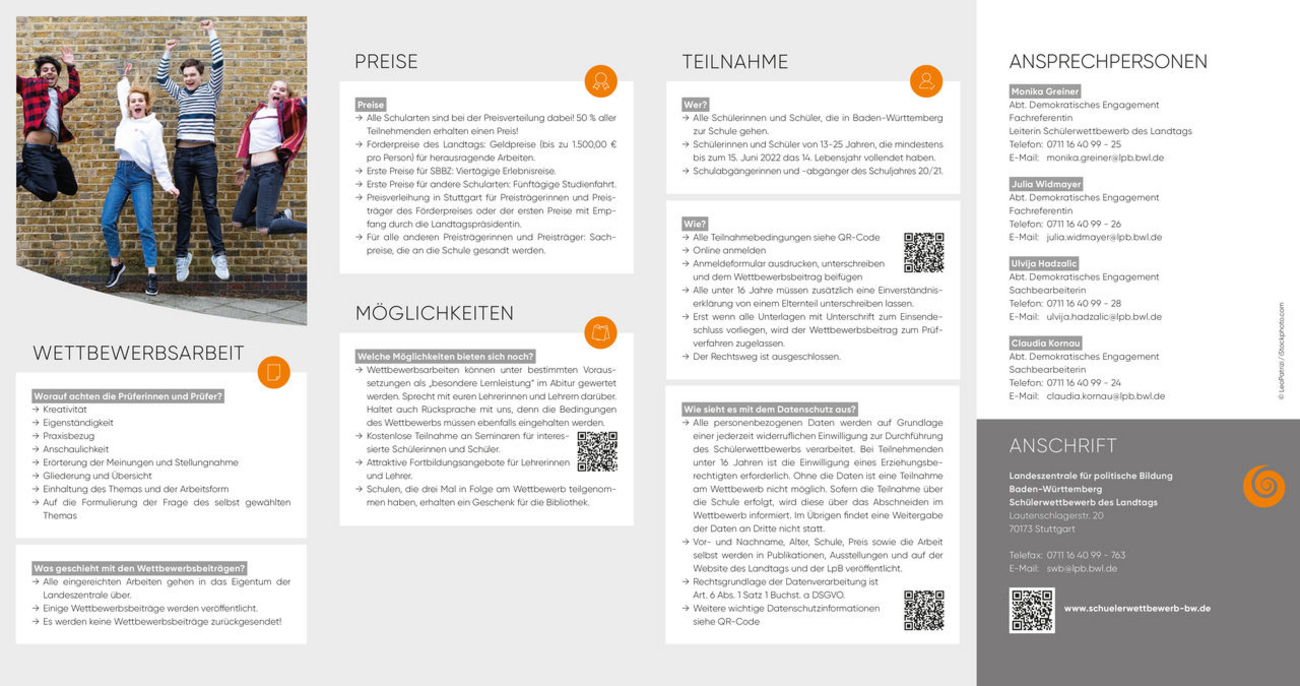 Einsendeschluss ist der 15. November 2021. Alle Themen sowie umfassende Informationen zum 64. Schülerwettbewerb sind auf der Homepage www.schuelerwettbewerb-bw.de zu finden oder können bei der vom Landtag beauftragten Landeszentrale für politische Bildung, Schülerwettbewerb des Landtags, Lautenschlagerstraße 20, 70173 Stuttgart, bestellt werden.