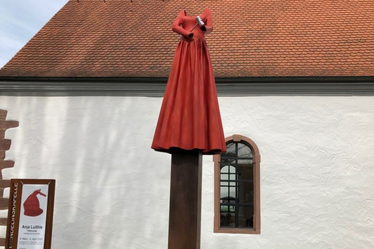 Bis zum 5. April ist ein solches rotes Kleid auch in Weil der Stadt vor der Wendelinskapelle zu sehen, dem Ausstellungsort des Kunstforums. Bei der Ausstellungseröffnung am Weltfrauentag stellte der Kunsthistoriker Dr. Heribert Sautter in seiner Einführung in das Werk auch die Konventionen zwischen den Geschlechtern zur Diskussion.