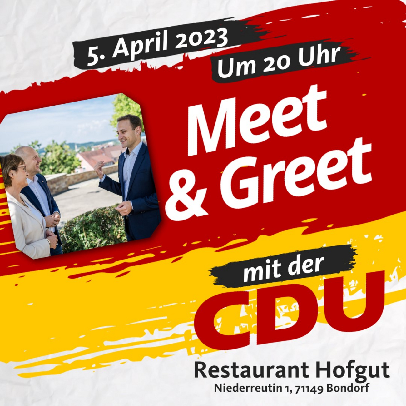 Der CDU Kreisverband Böblingen lädt alle interessierten Bürgerinnen und Bürger – ob Mitglied in der CDU oder nicht – herzlich ein zum Meet & Greet mit der CDU am Mittwoch, den 5. April 2023, um 20 Uhr im Restaurant Hofgut in Bondorf (Niederreutin 1, 71149 Bondorf). Wir freuen uns auf spannende Gespräche und einen lockeren Austausch über die aktuelle politische Lage mit den Abgeordneten Marc Biadacz MdB, Sabine Kurtz MdL und Dr. Matthias Miller MdL und heißen Sie herzlich willkommen. Eine Anmeldung ist nicht notwenig. Kommen Sie einfach vorbei.