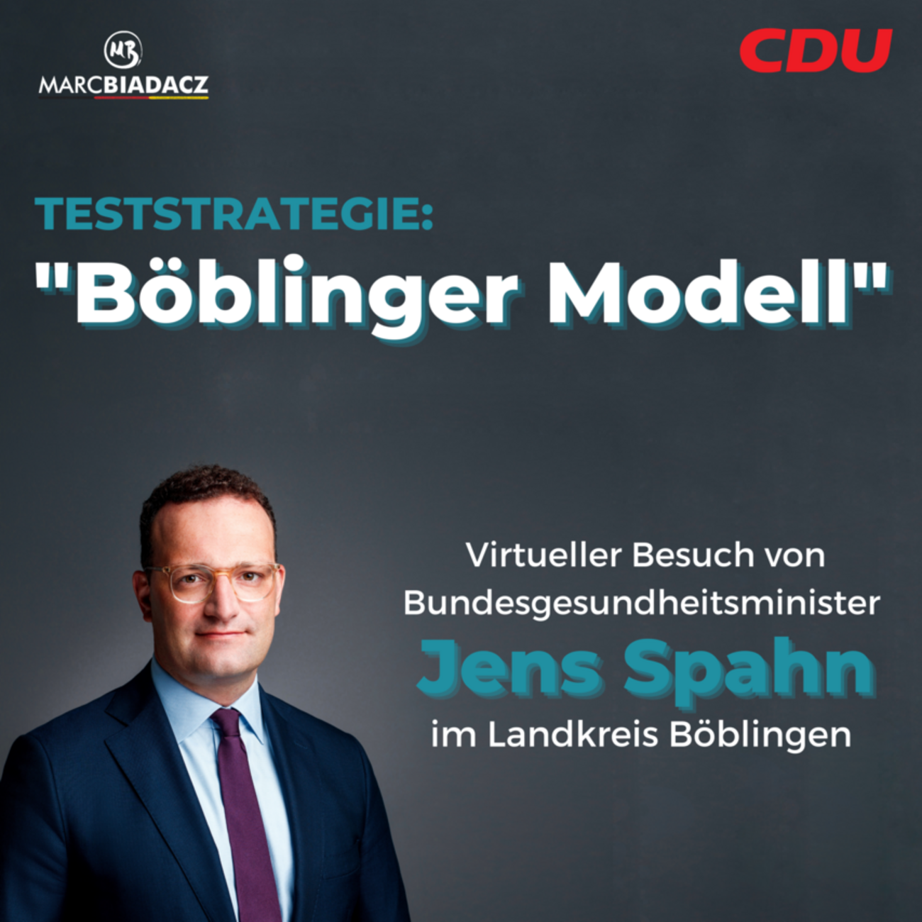 Marc Biadacz, direkt gewählter Bundestagsabgeordneter für den Wahlkreis Böblingen, lädt daher den Bundesminister für Gesundheit, Jens Spahn, zu einem virtuellen Gespräch über das "Böblinger Modell" in den Landkreis Böblingen ein. An der Veranstaltung werden außerdem der Landrat des Landkreises Böblingen, Herr Roland Bernhard, sowie der Apotheker und "Erfinder" des "Böblinger Modells", Herr Dr. Björn Schittenhelm, teilnehmen. Die Veranstaltung findet am Dienstag, den 30. März 2021, von 17.00 - 17.30 Uhr online statt.