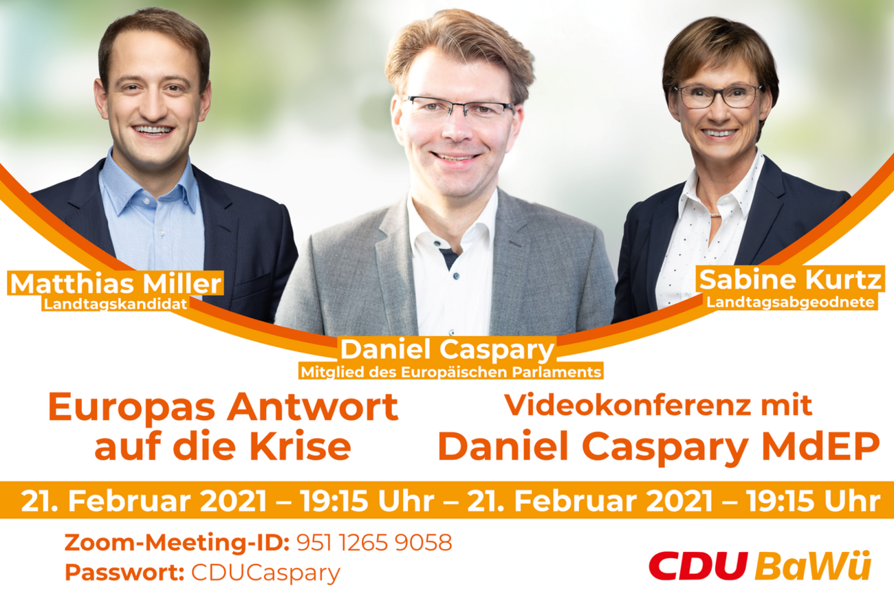 Die CDU-Landtagsabgeordnete Sabine Kurtz (Leonberg) und der CDU-Landtagskandidat für den Wahlkreis Böblingen, Matthias Miller, setzen ihre digitale Veranstaltungsreihe fort. Am Sonntag, den 21. Februar um 19.15 Uhr diskutieren sie mit dem Europaabgeordneten Daniel Caspary über Europas Antwort auf die Krise. Alle Interessierten sind herzlich dazu eingeladen! Die Veranstaltung findet online via Zoom statt. Interessierte können über die folgenden Anmeldedaten teilnehmen: www.zoom.us/join , Meeting-ID: 951 1265 9058, Passwort: CDUCaspary.
