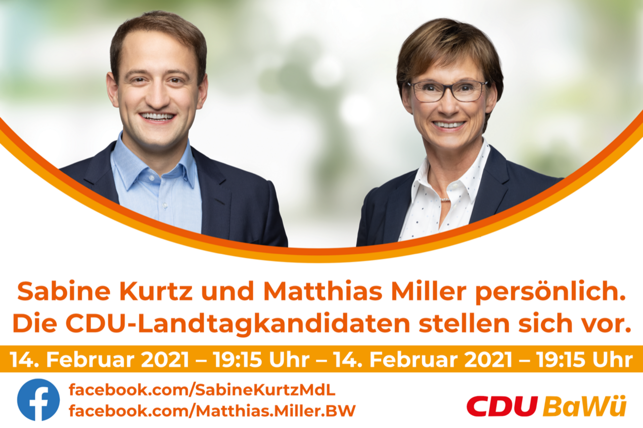 „Da persönliche Gespräche aktuell nur schwer möglich sind, möchten wir uns virtuell mit den Bürgerinnen und Bürgern austauschen“, betont Landtagsvizepräsidentin Sabine Kurtz. Am Sonntagabend, dem 14. Februar, stellen Sabine Kurtz und Matthias Miller deshalb ab 19:15 Uhr in einem Facebook-Livestream ihre Themen für die Landtagswahl vor. „Wir freuen uns auf die Diskussion und Ihre Fragen im Chat“, so Matthias Miller.