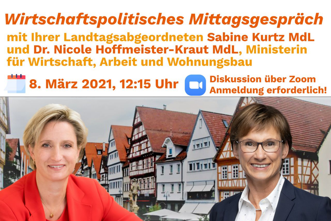 Darum geht es beim wirtschaftspolitischen Mittagsgespräch am Montag, den 8. März um 12.15 Uhr mit Dr. Nicole Hoffmeister-Kraut MdL, Ministerin für Wirtschaft, Arbeit und Wohnungsbau. Die CDU-Landtagsabgeordnete Sabine Kurtz lädt alle Interessierten herzlich dazu ein. Die Veranstaltung findet online via Zoom statt. Um Anmeldung unter sabine.kurtz@cdu.landtag-bw.de wird gebeten.