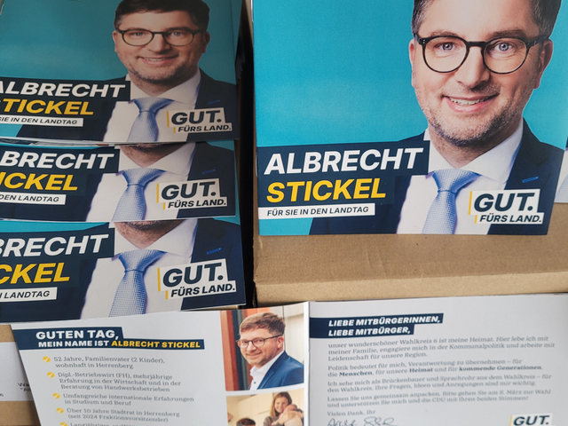 Wir haben inzwischen die Flyer von unserem Kandidaten Albrecht Stickel zur Landtagswahl 2026 in Weissach und Flacht ausgetragen. An den Türen gab es oft spontane Gespräche. Neben einigen kritischen Äußerungen haben wir meist auch Zustimmung und Unterstützung zur CDU entgegengenommen.