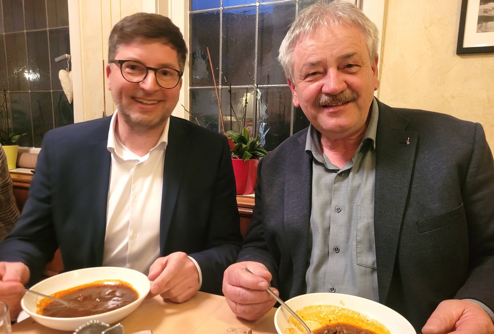 Stärkung am Wahlabend in Herrenberg. Albrecht Stickel nahm die Glückwünsche der CDU aus Weissach und Flacht gerne von Martin Jäckle entgegen.